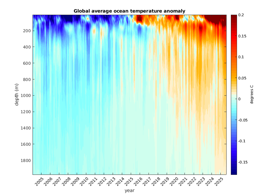 This plot of Argo data shows temperature anomalies averaged over the global ocean, down to 1900 meters, since 2004. While temperatures in the upper ~600 meters fluctuate with shorter-term climate events like El Niño-Southern Oscillation, deeper waters display a consistent warming trend. This deep signal is indicative of an overall warming of Earth's climate.