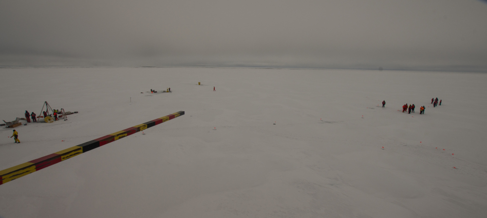 The second survey started portside, where there were fewer features in the ice. At this site, the sea ice thickness was 75cm, 80cm, 100cm, and 100cm at the TOP, SIMB, AOFB, and ITP sites respectively. The site was likely between four ridges, as seen on the ice radar, though no significant ridges were visible from the site. The TOP was deployed nearest to the ship, followed by the IMB, then the AOFB and finally the ITP. Snow cover was variable from one to five inches deep. Though the snow was generally firmer than at the previous station, there were numerous melt ponds hidden beneath the snow and almost everyone ended up with wet boots at one point or another. An ice survey was conducted forward of the IBO deployment.