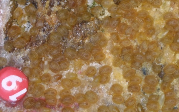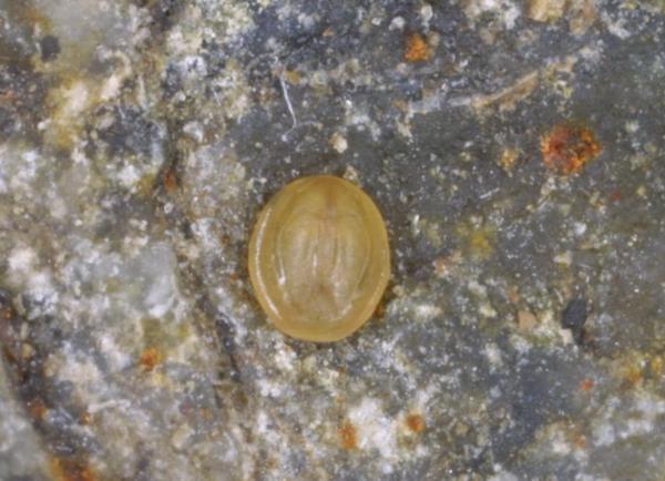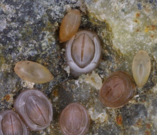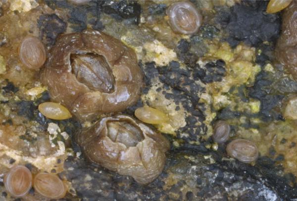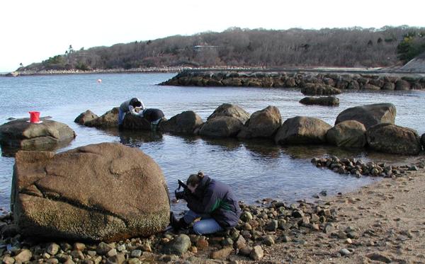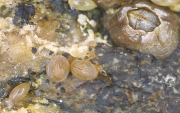 The name of this permanent quadrat is "the little friends" or "les petits amis". This spot is where we first observed cyprids in early January 2001, and we have been revisiting our little friends ever since. You can see Semibalanus balanoides cyprids, metamorphs and juveniles. The older two barnacles in the center left are Chthamalus.