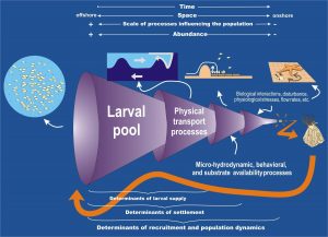- Consequences of environmental heterogeneity, particularly hydrodynamic phenomena, on larval behavior, larval transport, larval dispersal, settlement, recruitment and population dynamics