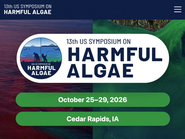 We are pleased to announce that the 13th U.S. Symposium on Harmful Algae will be held in Cedar Rapids, IA, from October 25–29, 2026. The HABs community is invited to contribute to shaping the symposium agenda by proposing and organizing sessions within their areas of expertise. Those interested in organizing a pre-conference workshop are also encouraged to submit a workshop proposal that offers hands-on training and practical learning experiences using cutting-edge tools, technologies, and methodologies related to HABs management. The deadline for both has been extended to Friday, January 16.