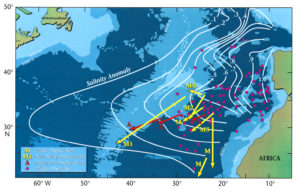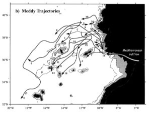 Mediterranean salt tongue and the locations and tracks of several Meddies (Mediterranean Water eddies) (1998).
