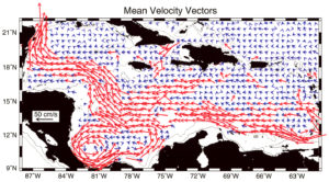 Average velocities in the Caribbean Current from surface drifters (upper figure, 2005). Trajectories of 19 cyclones (blue) and 19 anticyclones (red) inferred from looping drifter trajectories (lower figure, 2005).