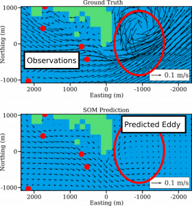 While the AUVs don't have the server-level computational power needed to run the full hydrodynamic model, they do have Nvidia Jetson Orin boards, letting them run compact and efficient surrogate models which can be updated in real-time as the AUVs collect data about the ocean flow. To match the predictive power of the hydrodynamic model, we are using data-driven approaches, replacing on-board computation with offline training. Our first attempt, using a Self-Organizing Map (SOM) showed promising results, including the ability to predict the existence of an eddy in parts of the environment where no direct observations had been made.